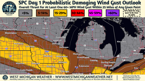 Locally damaging wind gusts are possible generally along and South of the I-94 corridor, especially East of the I-69 corridor as some renewed thunderstorm development may be able to strengthen in the wake of tonight's heavy rain showers and storms.