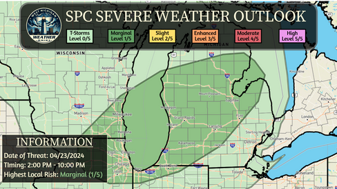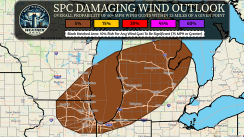 The NWS Storm Prediction Center has expanded the Marginal Risk for today to encompass more of western and southwestern lower Michigan in its most recent Day 1 Severe Weather Outlook.