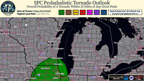 There is still some solution disparity amongst the various computer weather models but most foresee a weakly favorable environment that would be supportive of a rather low-end hail and wind threat across much of the West Michigan area. The tornado risk, thankfully, appears to be negligible (less than 2%) across the entire region.