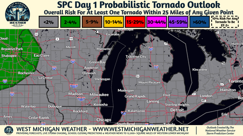 Showers and storms early Tuesday may pose an isolated strong to severe storm threat with damaging winds of 40-60 MPH being the primary concern as a complex of showers and storms moves in from the West. Current thinking with this line is that it will be concentrated along and North of M-20.