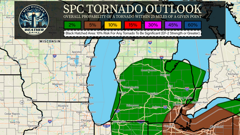 The SPC has upgraded tomorrow's risk to a Slight Risk (Level 2/5) for severe weather across much of southern and southeastern lower Michigan extending into parts of the West Michigan Weather coverage area. A smaller Marginal Risk delineation surrounds the broader slight risk area.